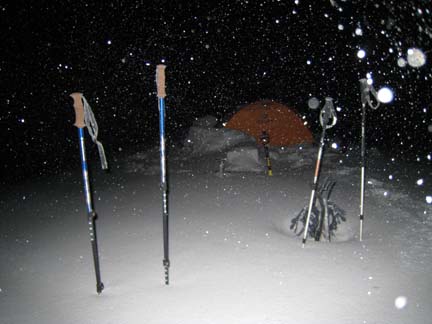 Saturday, February 10th After setting up our high camp and our climb of Gladstone Peak the previous day we were in no hurry to get rolling and slept in until around 7am. It had been a breezy night with intermittent snow pellets pounding the tent but nothing serious. I poked my head out of the tent and noticed the cloud deck was low enough to obscure the summits of Gladstone and the surrounding peaks. But the temperature was warm and the forecast for cloudy but stable weather seemed to be holding true. For a moment Cynthia and I discussed bailing on the attempt of Wilson Peak but I don't believe either of us was actually serious about that idea. So it was on! I heated up some water for drink and hot cereal (thanks to Cynthia for the nicely compiled granola/raisin/powdered milk cereal), we packed up and left the camp around 8:15am. Our plan was to descend from camp to about 11,400' and make an ascending traverse around the low end of Gladstone's east ridge to gain what appeared on the map to be a nice bench in upper Bilk Basin and then eventually reach the base of Wilson Peak's south face around 12,900' before climbing straight up the face to intersect the west ridge around 13,800'. From there we'd take the west ridge to the summit. The ascending traverse around the lower end of the Gladstone's east ridge worked out nicely despite being a bit steep and hardpacked in places. That made it hard for me to skin up on my splitboard and I'm sure wasn't too enjoyable for Cynthia on her snowshoes. But alas it was over quickly and we soon found ourselves on a nice flat bench looking into upper Bilk Basin. ![]() Cynthia traversing the lower end of Gladstone's east ridge at about 11,700'. Our high camp is just below the saddle in the background.![]() Making tracks on the nice bench around 11,900' in Bilk Basin just north of Gladstone's east ridge.We did one more steep, ascending traverse of a slope I wasn't particularly pleased about (due to depth hoar lurking below the six inch crust surface) but it was over quickly and without incident. At 12,900' we were looking straight up the south face of Wilson Peak and were very encouraging with what lay ahead. Looking higher into the basin we could see the well-preserved cabin perched at the head of Bilk Basin. Here we opted to stash the snowboard and snowshoes and bust out the crampons and ice axes for the remainder of the climb. Off we went following a line of great step-kicking snow up the south slope. ![]() Working on up the south slope of Wilson Peak.I optimistically hoped we had reached the ridge above always-entertaining "north side traverse" of the standard route but after ascending the ridge for a couple of minutes we found ourselves peering down into the notch that marked the start of this little traverse. D'oh! I've been through this section in spring, fall and now winter, and it's alway an attention-getter! This time was no exception. Cynthia proclaimed we must carry on and so it was. I started down first face-in and kicking steps into the snow and feeling for good rock with the front-points of my crampons. This carried on until we were well into the notch and then traversing east slowly groping for holds on rock and feeling for foot placements. It took us about 40 minutes to go the final 100' vertical to the summit but we were there at 1:30pm and stoked! ![]() Cynthia walking the final bit of ridge to the summit. Note the tent-poles cross adorning the summit area in the lower right portion of the photo.![]() In the notch of the north-side traverse. Check those hand holds and steps!![]() Exiting the notch on the return.![]() Ah yes, getting ready for some riding.That night we hit the sacks around 8:00pm just as it really began to snow in earnest. It snowed all night and when we got up at 6:00am, there was close to 10 inches of new snow on the ground! ![]() Sunday morning--new snow!![]() Starting the hike out in the drab, hard to see conditions.